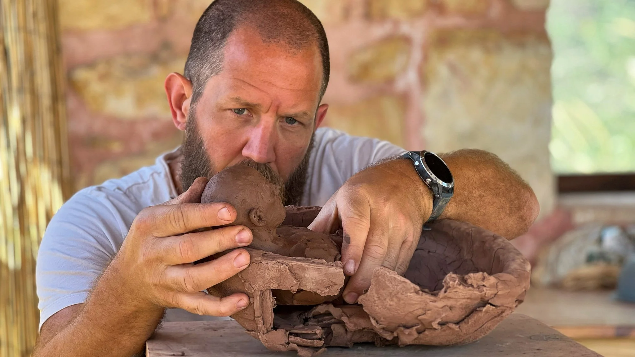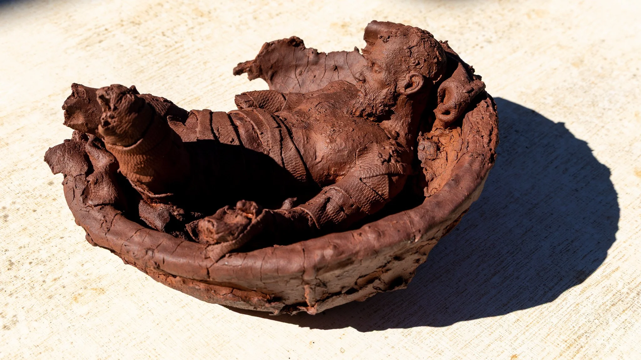 a vessel came first, with no clear plan of the final work, just responding as it built itself. i used a salad bowl as the base, building up sections, letting it dry in the cyprus summer heat. once it felt done, i started on the figure. looking back, i can see subconscious ideas playing out. life events entered the work whether i wanted them to or not. they shaped my subconscious and the choices i made. but i wasn’t trying to turn arkard into a statement. i was trying to let the work become what it needed, without forcing it to have a purpose. that’s still how i work.