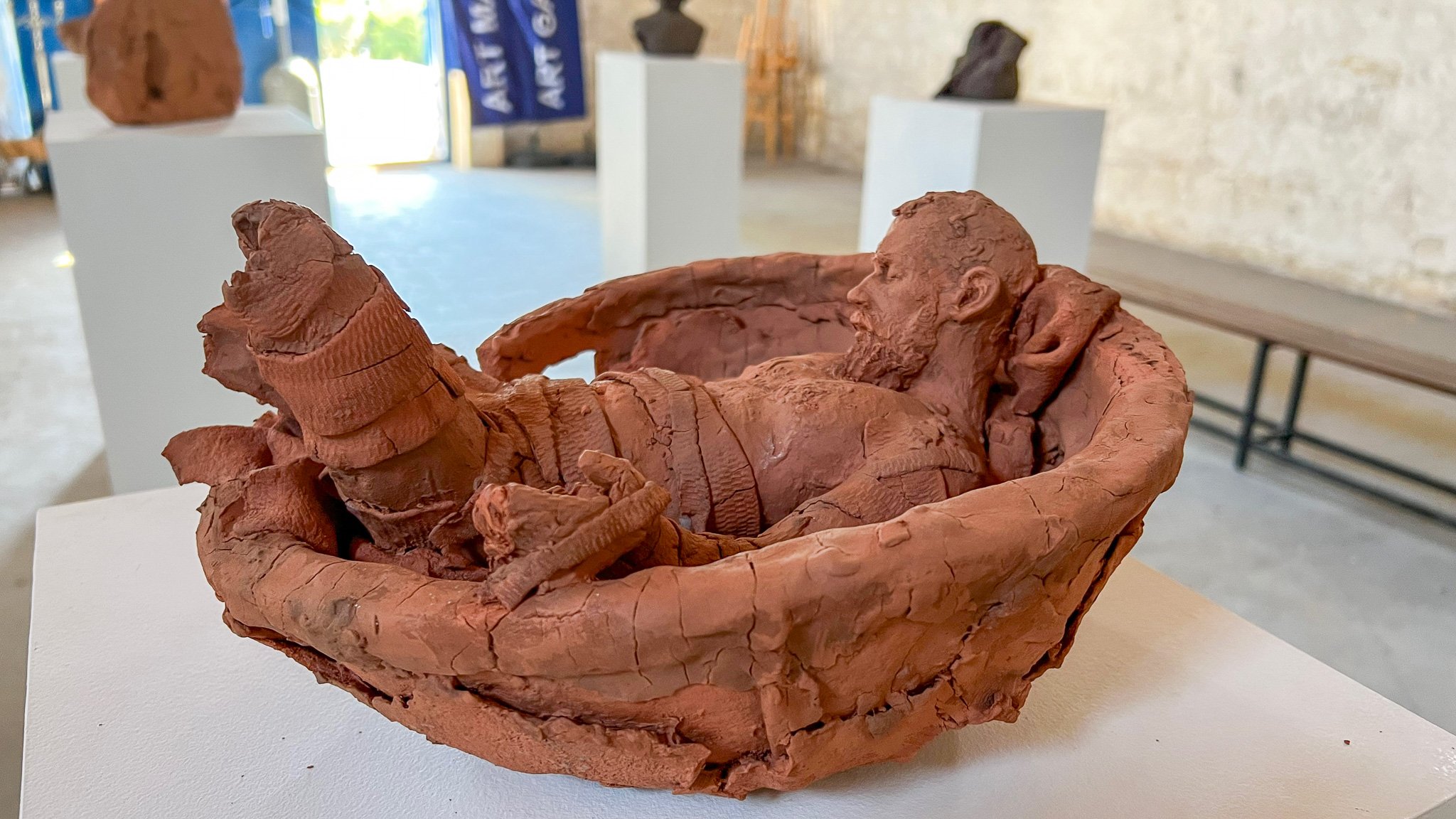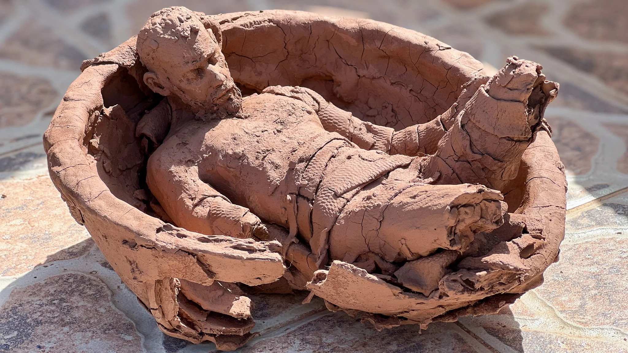 then the clay started teaching me something else. before firing, pieces began breaking off. unfired clay is delicate, and i had to transport the work by car to the makers space, which is both a studio and a gallery. from there, lee-anne carried it into the kiln. the vessel was the most vulnerable part. the figure, by contrast, was created broken from the start: no legs, and one half of the arm missing. i built it to look damaged. what i didn’t know then was that the material itself would insist on the same language. even after firing, it didn’t stop. the clay would break where i hadn’t intended it to, as if it had its own idea of fragility.